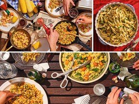 Clockwise from top left: Shrimp and andouille mac 'n' cheese, left, and Cajun crawfish carbonara with cascatelli; cavatelli with roasted artichokes and preserved lemon; and raw heirloom puttanesca with fish sauce and Calabrian chili, left, and conchiglie with corn, avocado, and fried (or grilled) halloumi