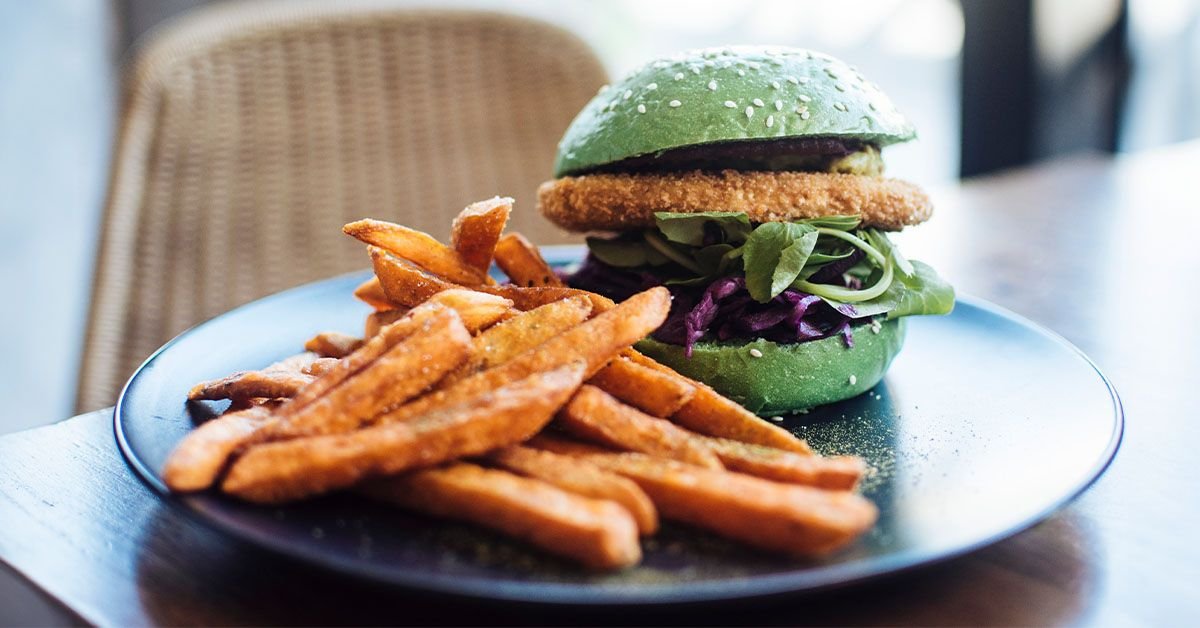 plant-based burgers and friesShare on Pinterest