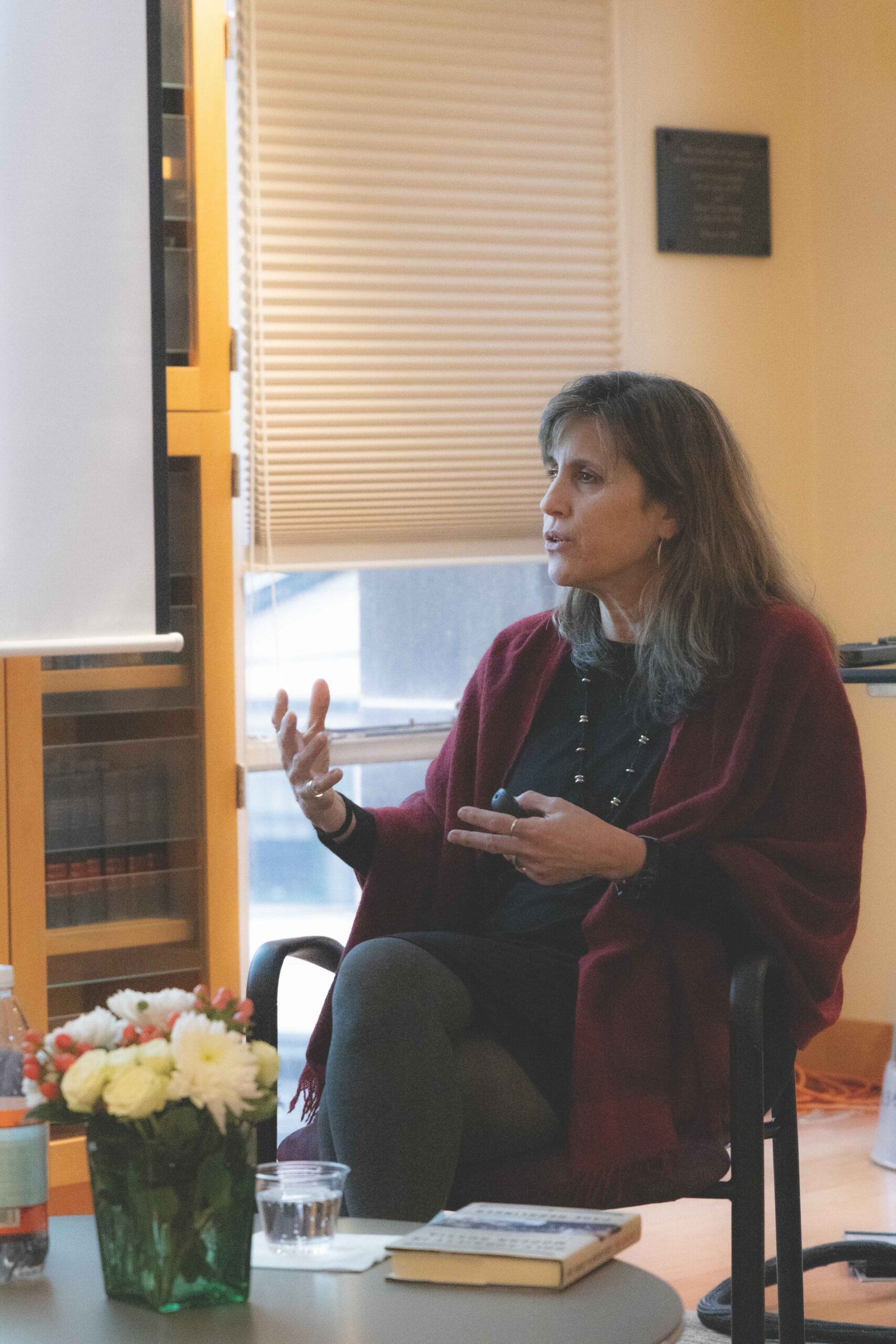 Sacred history: History professor Paige Hellinger gestures about her new book, “Sacred Abstinence in Modern Russia: The Healer of Faith,” in the Nixon Lounge of the Hawthorne Longfellow Library. This book explores the theme of 20th century Russian religion and its enduring legacy.