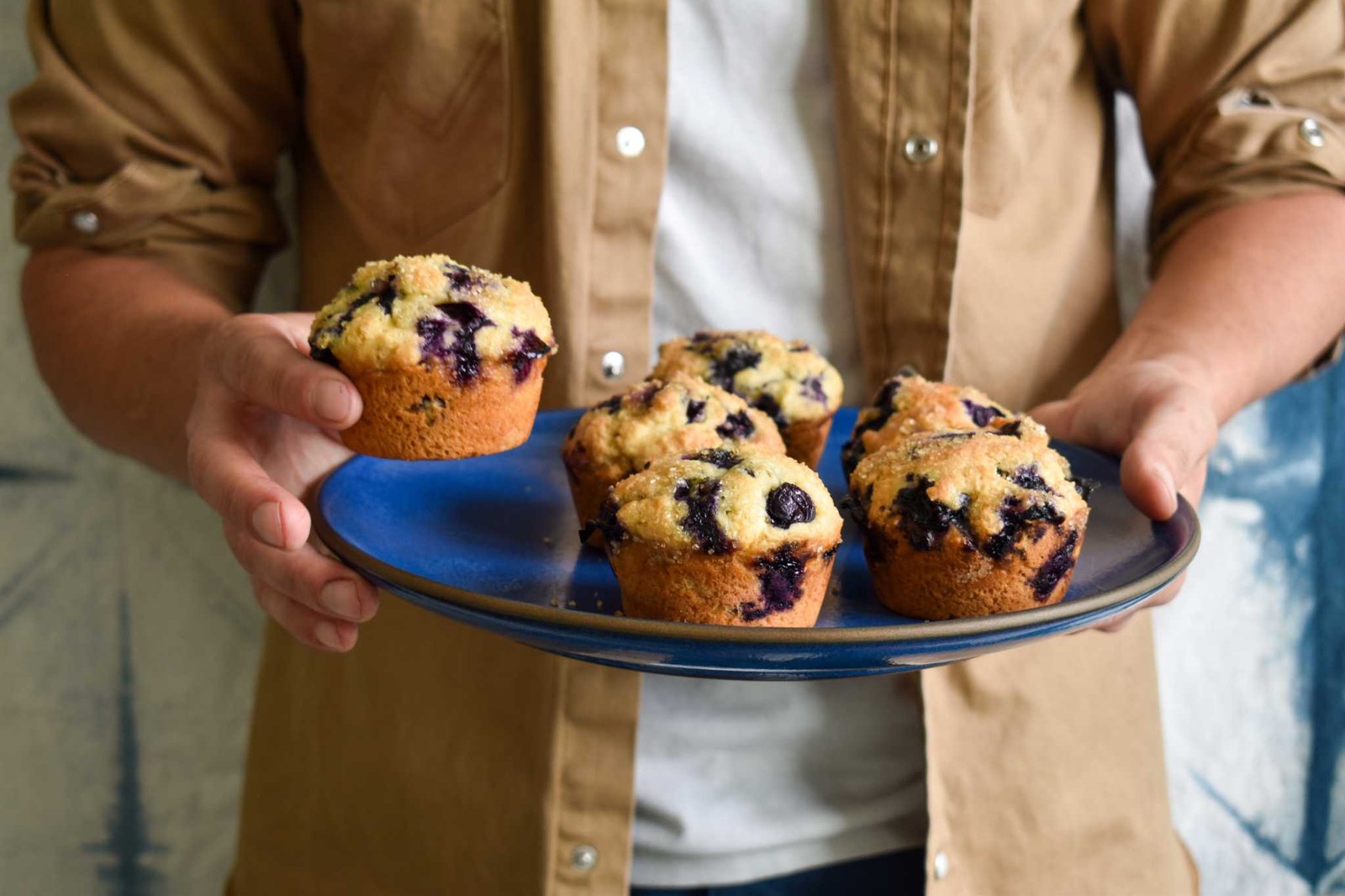 The dough is made like any easy quick bread: mix the dry ingredients in one bowl and cream the butter and sugar in another. Beat in the eggs and full-fat sour cream to create a thick, cookie-dough-like batter that results in fluffy, light muffins. The berries don’t fall to the bottom; to really ensure they don’t fall out, I put a dollop of plain batter in the pan first so the blueberries are perfectly scattered throughout. A non-negotiable for me.