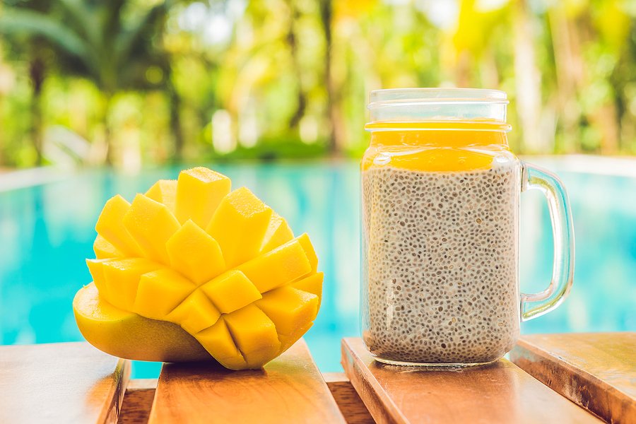 Chia seed pudding with almond milk and fresh mango topping, with a pool in the background.