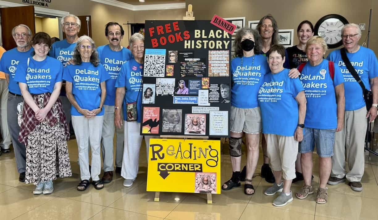 DELAND QUAKERS AT JUNETEENTH CELEBRATION — Members of the DeLand Quakers were all smiles after distributing 689 Black history books during their Juneteenth celebration at Earl Brown Park on June 15. The group also set up a reading corner where volunteers read the books to families. Front row, from left: Sarah Ringo, Lynn Peterson, Kathy Hirsch, Carol Reed, Susan Vaughn and Beag Camarota. Back row, from left: Jim Cain, Carl Hirsch, Bill Brennen, David Cargill, Diane Jobson Cargill and Dan Vaughn.