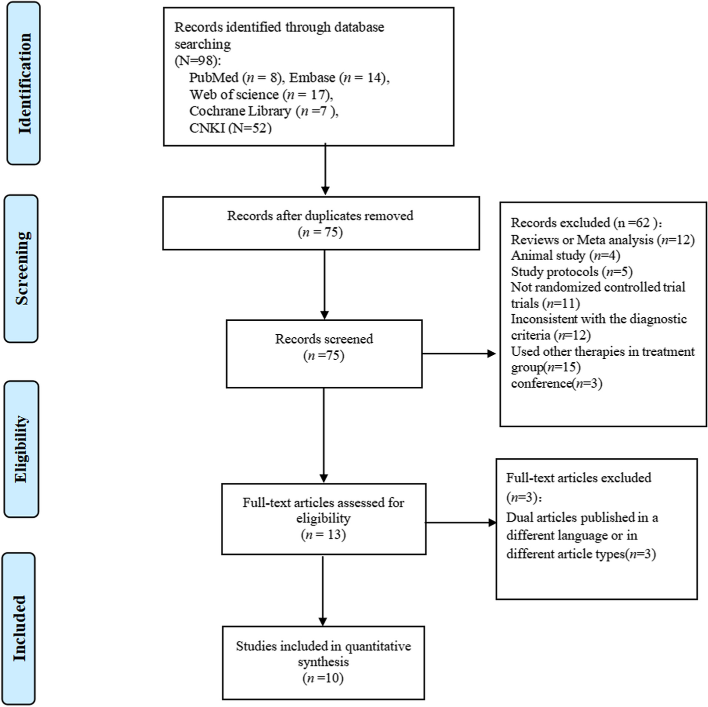 According to the literature search strategy, 98 articles were initially retrieved from five databases, including 8 articles in PubMed, 14 articles in EMBASE, 7 articles in Cochrane, 17 articles in Web of Science and 52 articles in CNKI. Second, a total of 65 articles were excluded by reading article titles, abstracts, and full texts. Two of the articles [23, 24] were the same study, but included different fMRI data. Ultimately, we included 10 studies (including 11 articles) [21, 23,24,25,26,27,28,29,30,31,32]. The process of literature screening based on PRISMA is shown in Fig. 1.