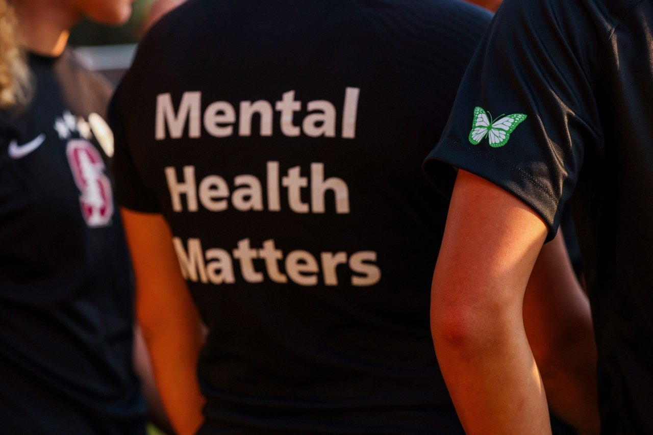FILE – Players on the Stanford University women’s soccer team wore warm-up jerseys with “Mental Health Matters” on the back and a butterfly patch on the sleeve in memory of the late goalkeeper Katie Meyer, who committed suicide earlier this year, before an NCAA college soccer game between UCLA and Stanford, Calif., Oct. 14, 2022. (Yarhonda M. James/Associated Press via San Francisco Chronicle, File)