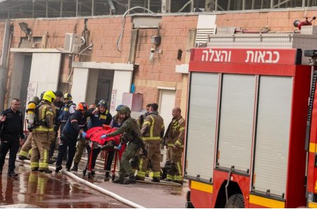 Israeli rescue workers recover the body of Zaher Bishara, who was killed in a Hezbollah rocket attack on Kiryat Shmona on March 27, 2024. (Erez Ben Shimon/TPS)