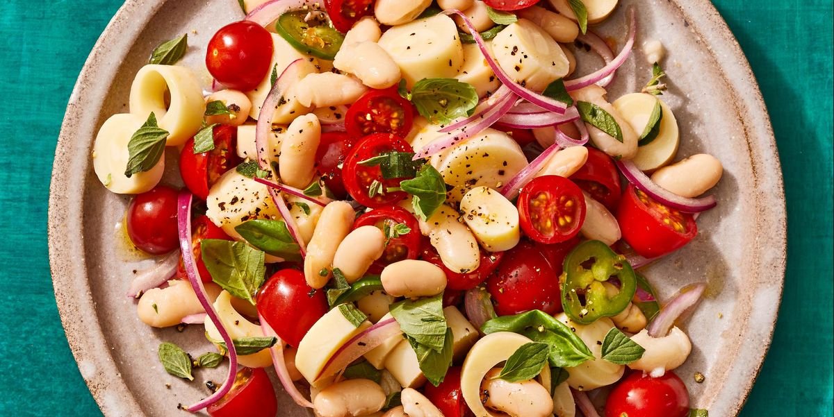 - step 2Add the palm core, beans, and tomatoes and mix. Stir in the basil and top with cracked pepper, if desired.