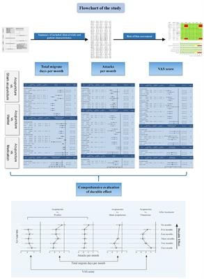 We identified relevant original studies following the PICOS principle (Table 1): Steiner et al. (2019) study type: RCTs; (Stovner et al., 2022) object of study: adult (age ≥ 18) patients with episodic migraine (with or without aura); (Ashina et al., 2021) intervention: acupuncture (including manual acupuncture, electroacupuncture, fire needling acupuncture, auricular acupuncture, scalp acupuncture, and warm needle moxibustion) compared with sham acupuncture, waitlist, or any pharmacological therapy (acute or prophylactic treatment); (Steiner et al., 2020) primary outcomes: the article must report at least one of the following primary outcomes and follow-up the patients for at least 3 months after treatment: ① total migraine days per month, ② attacks per month, ③ visual analog scale (VAS) score or numerical rating scale (NRS); [Headache Classification Committee of the International Headache Society (IHS), 2018] peer-reviewed articles that have been published in a journal; (Marmura, 2018) published in English or Chinese.