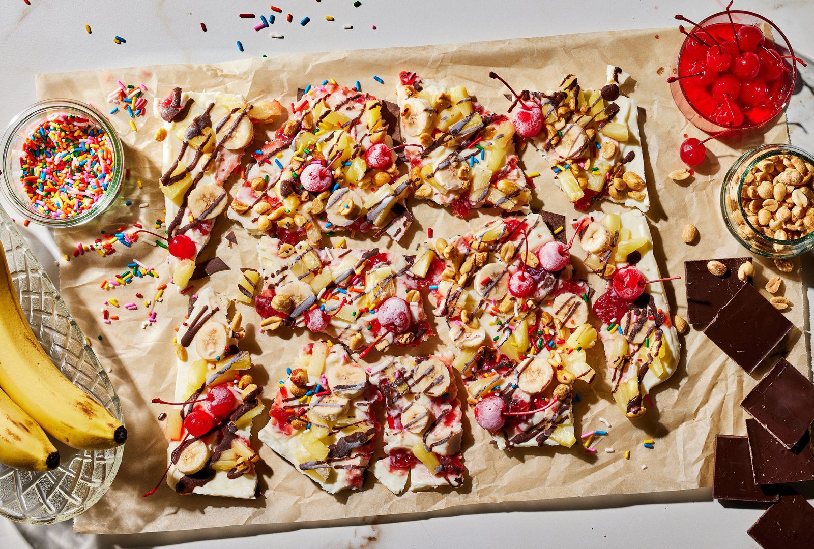 Place a layer of semisweet chocolate and coconut oil on a baking sheet lined with parchment paper as a base. Then, after the semisweet chocolate and coconut oil have cooled, layer with vanilla Greek yogurt and pudding mix. Now comes the fun part. Mix the yogurt with a little strawberry jam, add pineapple pieces, banana slices, crunchy salted peanuts, a few maraschino cherries and, of course, pour in some melted chocolate at the end.