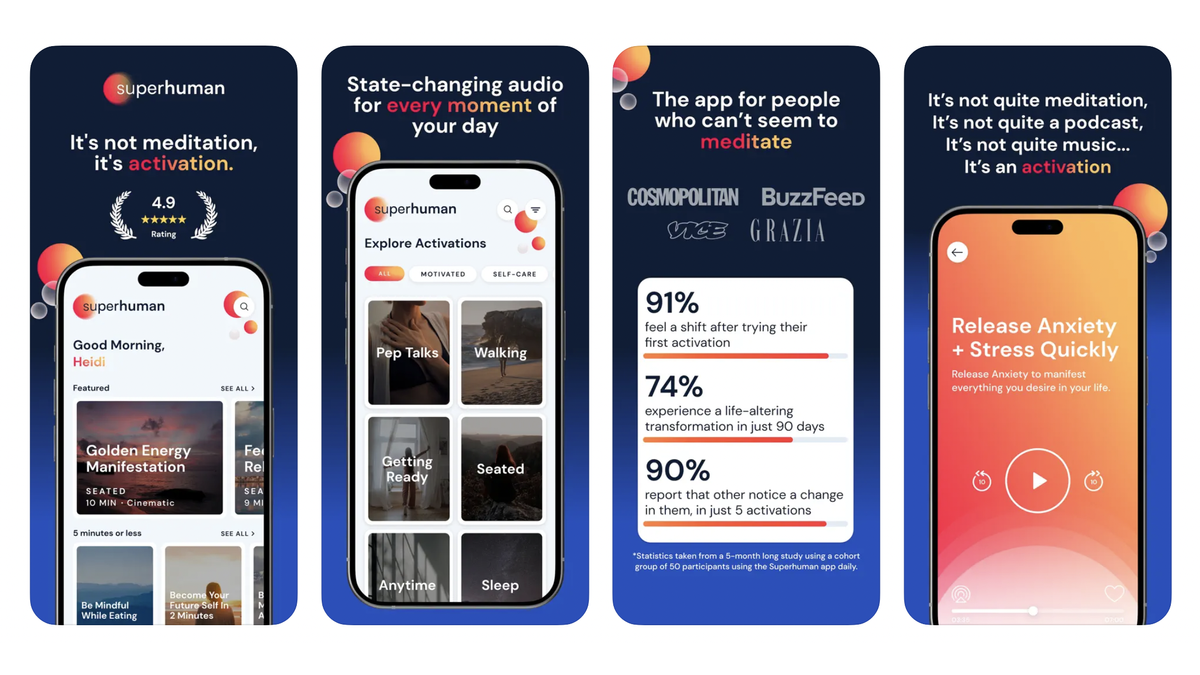 Superhuman is built around “activations,” which sound like guided meditations, but the point is that you engage with them more actively, and you can also listen to them while you’re active. You can choose one that is optimized for walking, doing housework, or falling asleep. This makes it perfect for people who are too busy to take time for uninterrupted meditation, or who find it difficult to sit quietly and meditate.