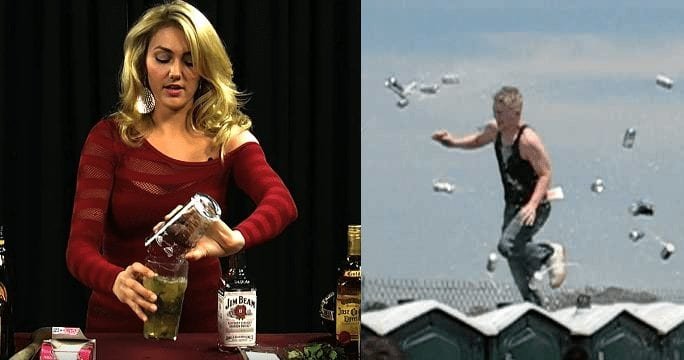 Now, this is very important and you should pay close attention to what she does, not what she says. She’s going to say you need 2 ounces of bourbon. Now, I never took any particular measurements, but she pours half of that damn bottle into that pint glass.