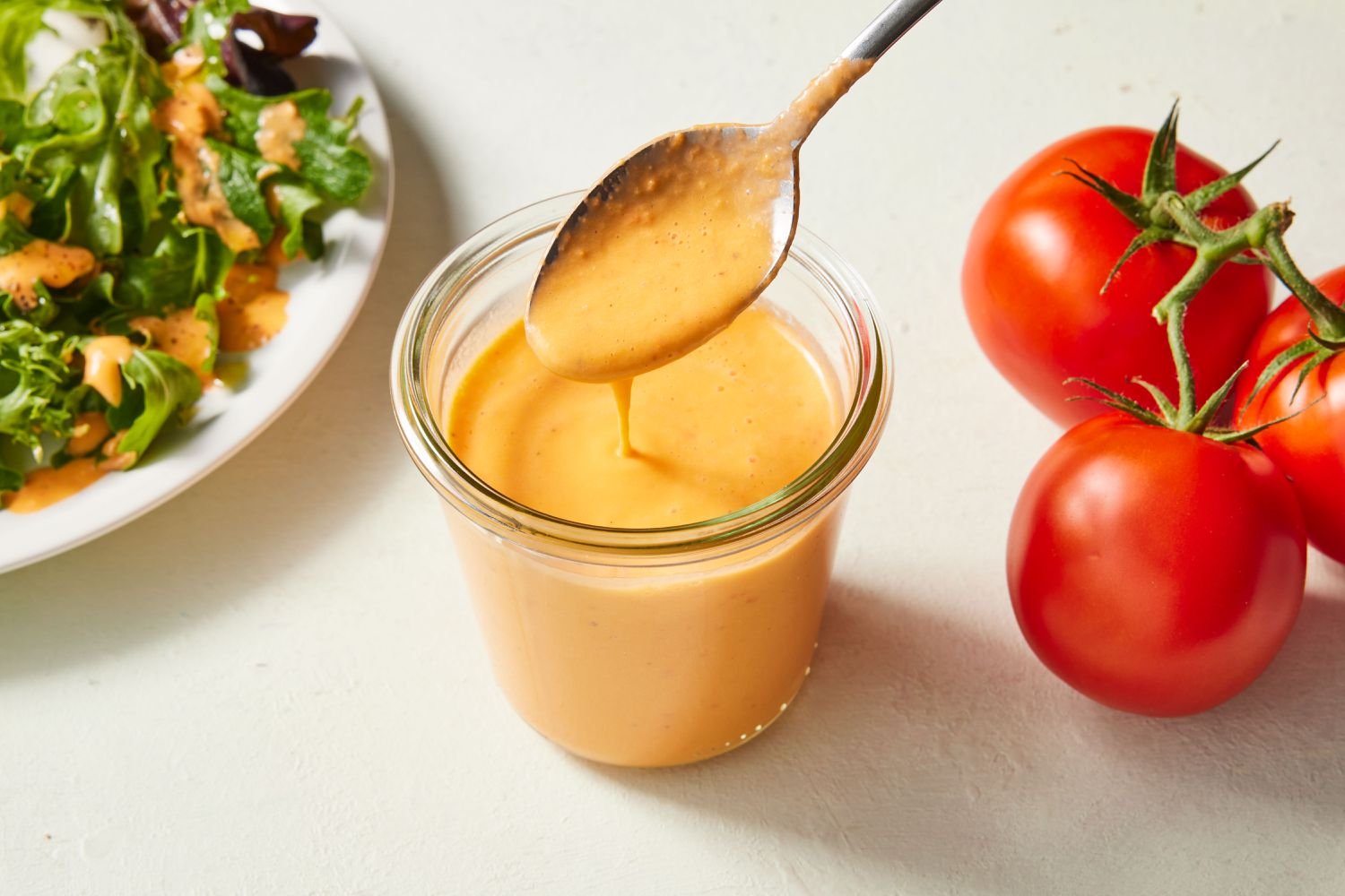 This creamy tomato-flavored vinaigrette is especially delicious when paired with a BLT salad, a take on the classic sandwich made with bacon, lettuce, blue cheese, tomatoes, and tomato vinaigrette. When tomatoes are tasty, try it in place of your regular dressing for a refreshing summer upgrade.