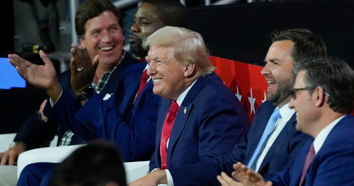Republican presidential candidate and former President Donald Trump and Republican vice presidential candidate Sen. J.D. Vance (R-Ohio) attended the first day of the Republican National Convention, along with Tucker Carlson, Rep. Byron Donald (R-Fla.), and House Speaker Mike Johnson.AP Photo/J. Scott Applewhite