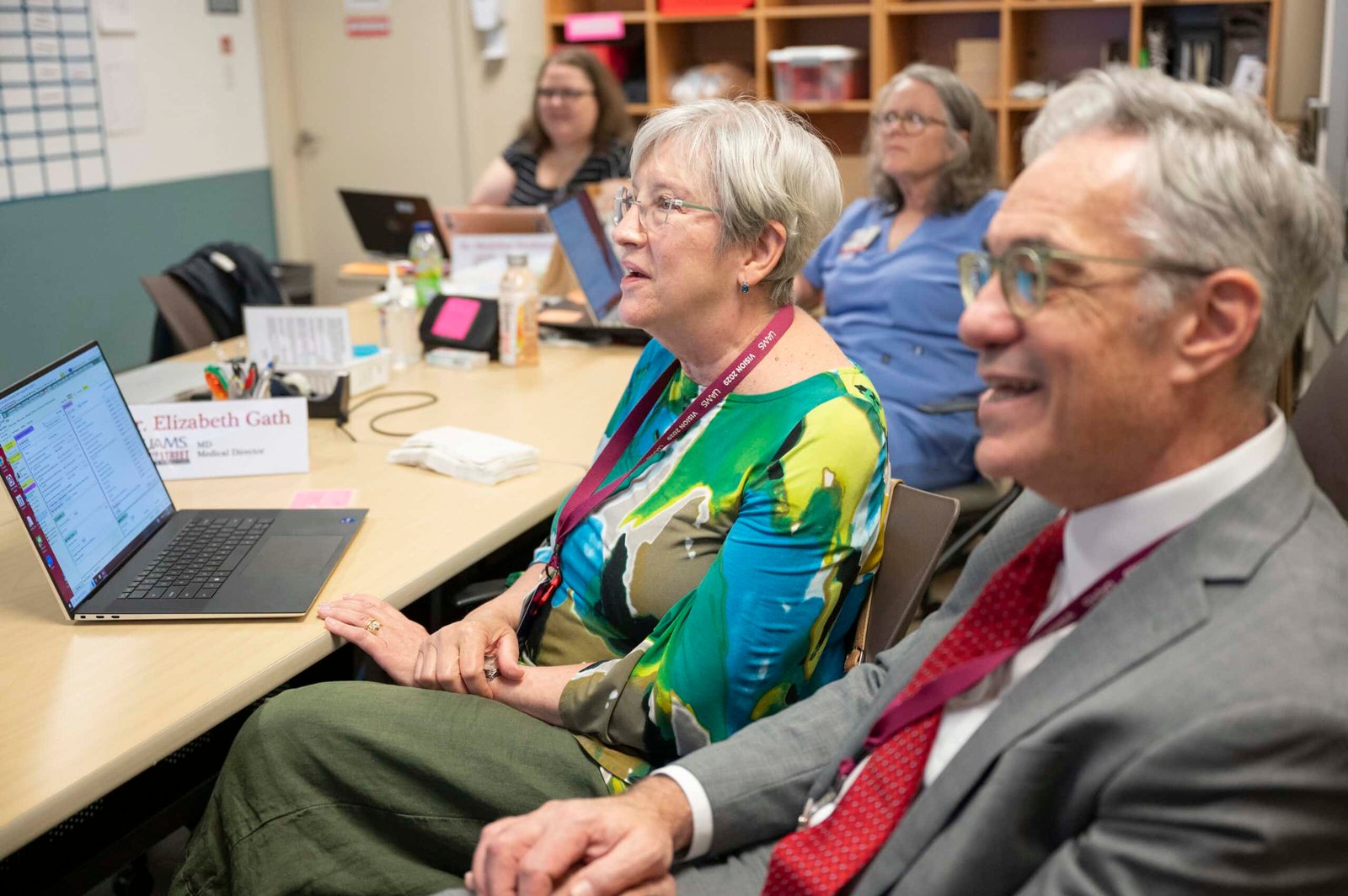Stephen Weber, MD, dean of the School of Medicine and UAMS vice chancellor, and Elizabeth Gass, MD, listen to student presentations about patients at the 12th Street Health and Wellness Center.