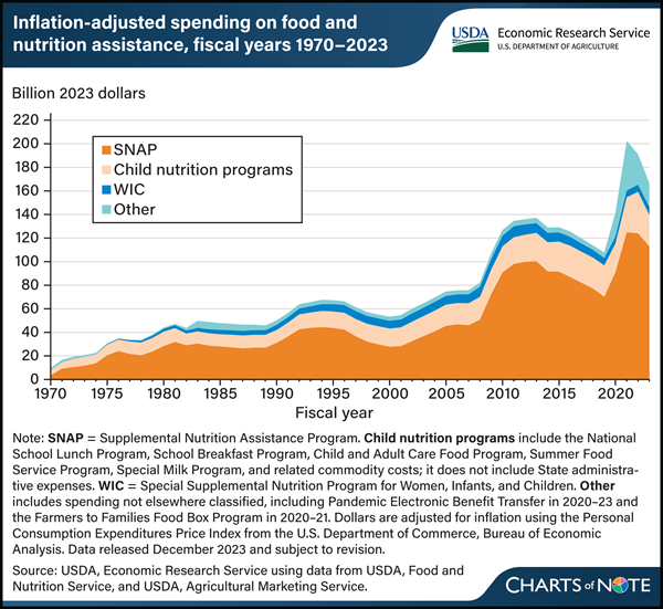 Federal spending on USDA food and nutrition assistance programs totaled $166.4 billion in FY2023, down 13 percent from $191.1 billion in FY22 and down 18 percent from the FY2021 peak of $202.4 billion when adjusted for inflation to 2023 dollars. In FY2023, spending on the Supplemental Nutrition Assistance Program (SNAP) decreased 9 percent from the prior year’s inflation-adjusted amount to $112.8 billion, despite increases in participation and maximum benefit amounts. The decrease occurred due to the nationwide end of emergency allocations that had temporarily increased benefits for all recipients to at least the maximum for their household size since March 2020. Spending on the Special Supplemental Nutrition Program for Women, Infants, and Children (WIC) totaled $6.6 billion, up 11 percent from FY22 inflation-adjusted spending, reflecting increases in program participation and food costs per participant. Total spending on child nutrition programs was $26.9 billion in FY2023, a 24% decrease from the previous year’s inflation-adjusted total. FY2023 marked the child nutrition program’s first full fiscal year of operation after a federal waiver allowing schools to provide free meals to all students and increasing federal reimbursement per free meal expired at the end of June 2022. Total spending on other programs in FY2023 decreased primarily due to lower spending on Pandemic Electronic Benefit Transfer (P-EBT) in its final year of operation. This chart is based on data available as of December 2023 and appears in the USDA Economic Research Service’s “Status of Food and Nutrition Assistance: Fiscal Year 2023 Annual Report,” released in June 2024.