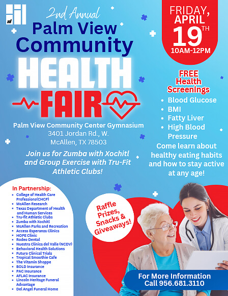The Palm View Community Health Fair is free and open to the public. For more information, call Palm View Branch Library at (956) 681-3110 or visit the website www.mcallenlibrary.net/events/pvhealthfair.