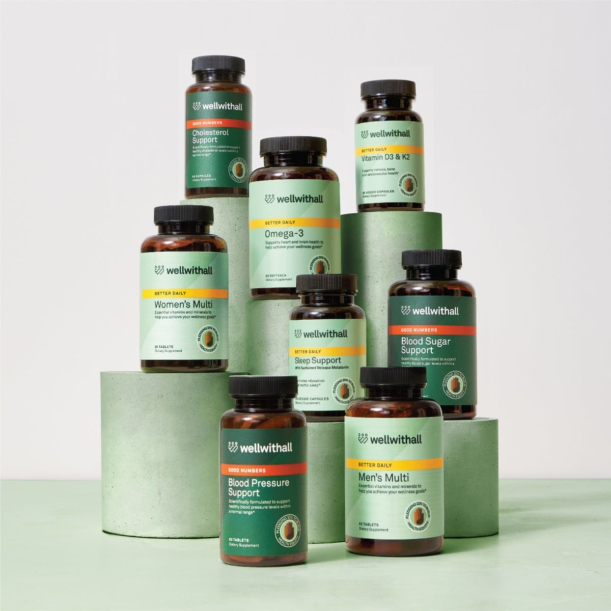 “WellWithAll has launched two product collections inspired by the health that everyone deserves. Because heart health disproportionately affects communities of color, our first collection is Good Numbers, a set of condition-specific supplements that support blood pressure, blood sugar, and cholesterol. These are all measurable, so we named this subgroup Good Numbers to encourage individuals to know their numbers and take an active role in their health,” Martin says. “Our second collection, Better Daily, focuses on everyday wellness, with a multivitamin, vitamins D3+K2, and omega-3 fatty acids aimed at supporting simple, everyday commitments to a healthier lifestyle.”