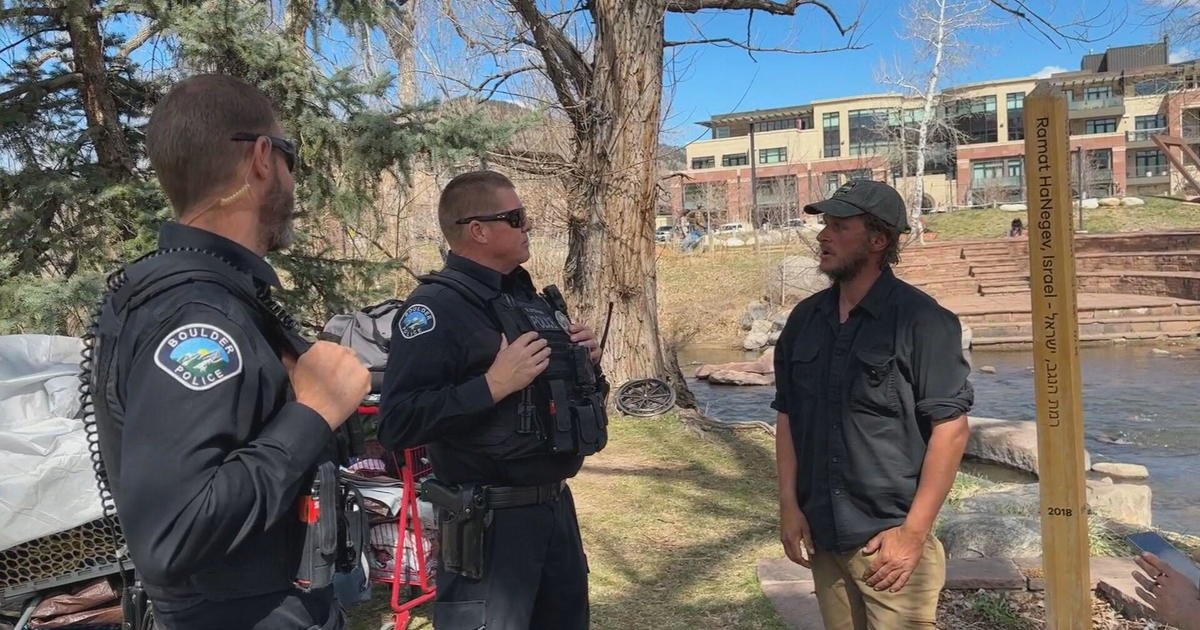 It’s a sunny day with blue skies in downtown Boulder. Police officers Keith Steinman and Ross Maynard walk the green lawns in and around the bandshell, where people experiencing homelessness spend much of their time.