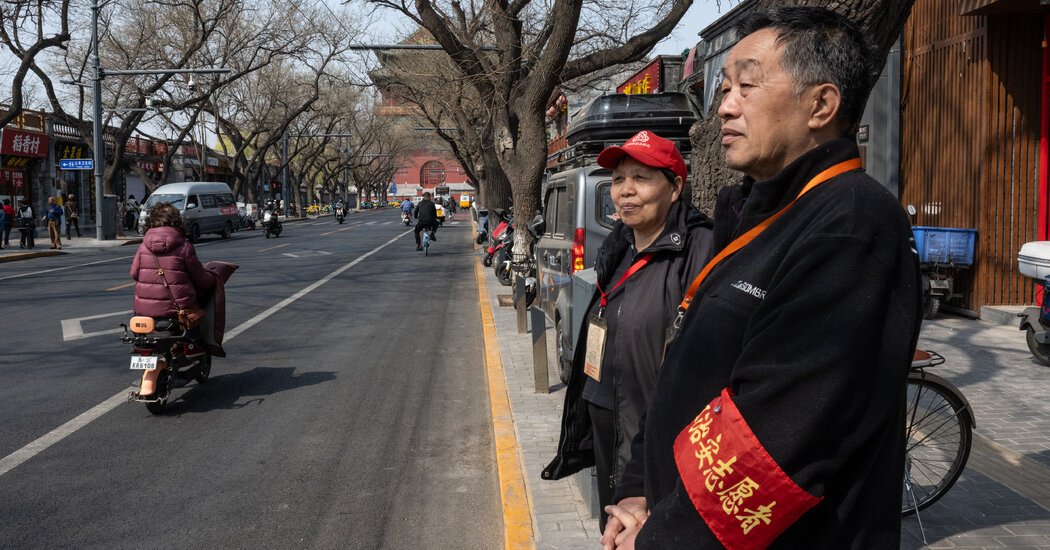 On a recent Thursday in central Beijing, two residents stood on the sidewalk wearing red vests and name tags. They would be there for two hours in the morning and two in the afternoon, guarding their assigned grid unit of three apartment buildings, said one of them, Qi Jinyou, 76. Other duos were stationed regularly down the block.